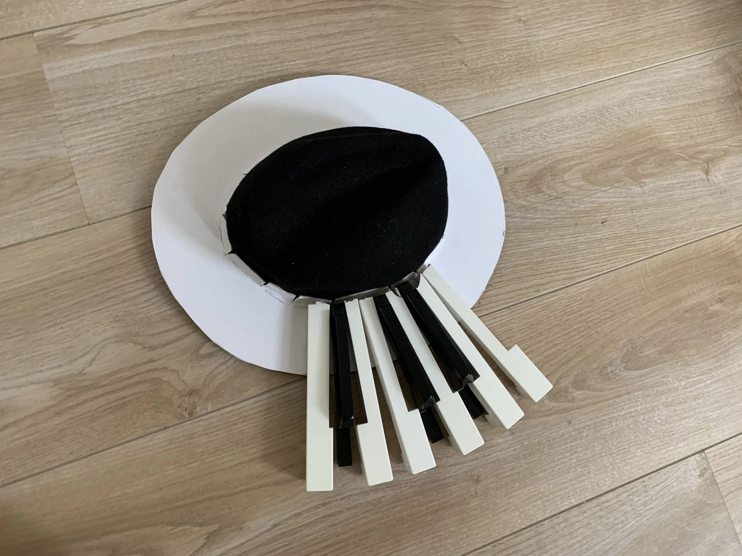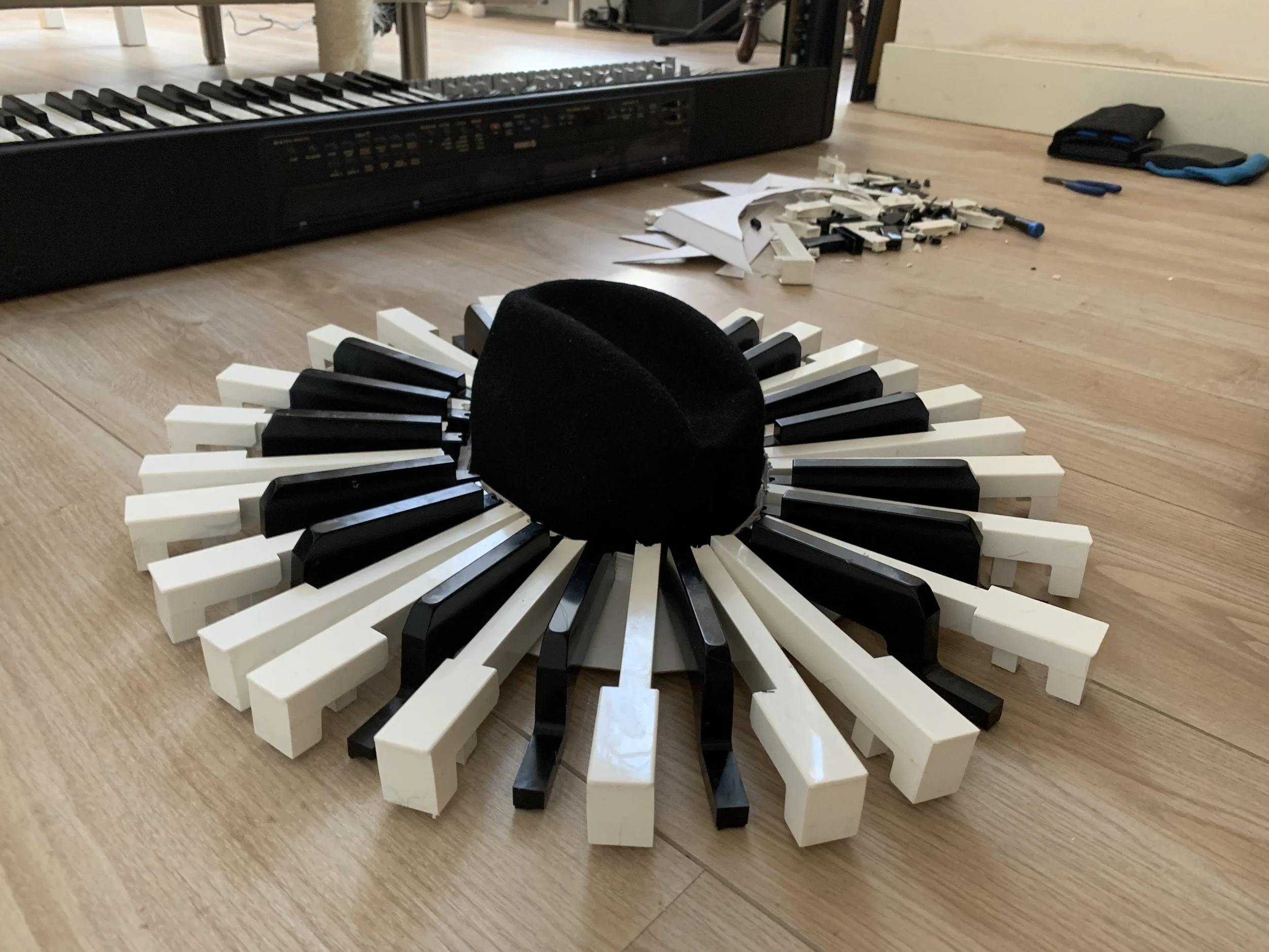 Hier zie je de pianohoed gemaakt van de toetsen van mijn oude piano (hij gaat nog gebruikt worden bij komende projecten),
