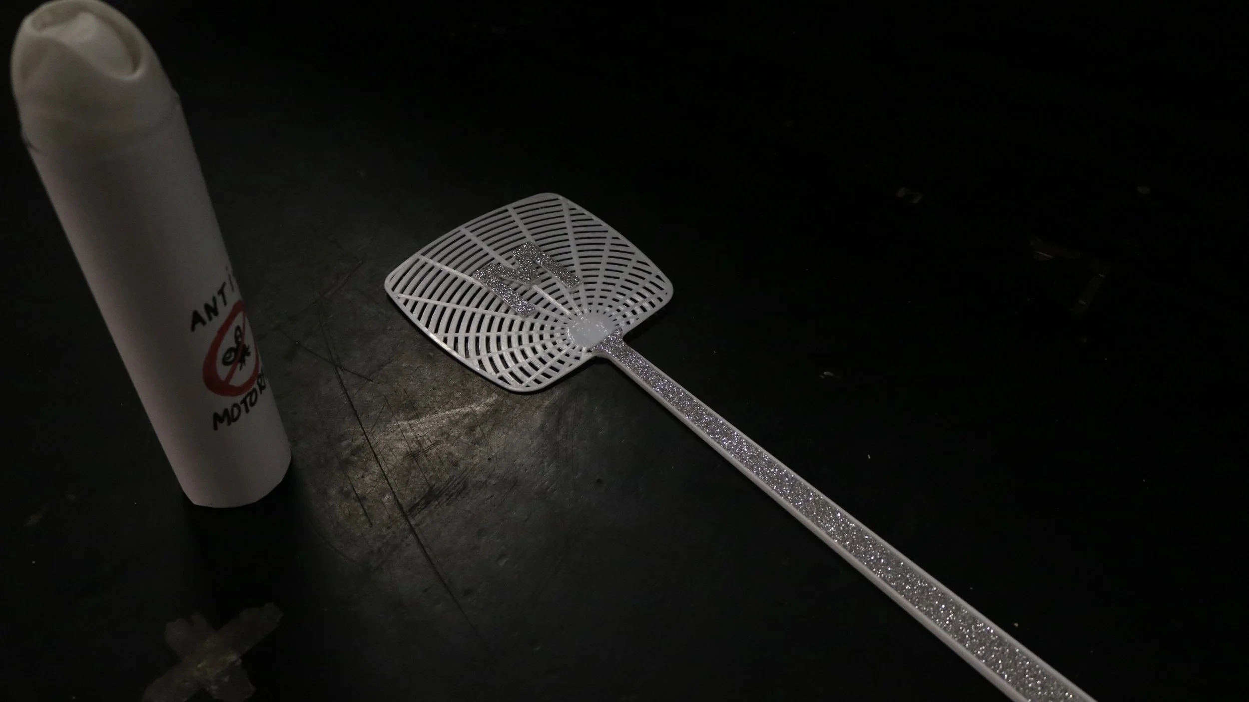 de lichtringen voor het nummer ‘Headlights’ en een customized vliegenmepper voor de clip ‘Motorfly’.